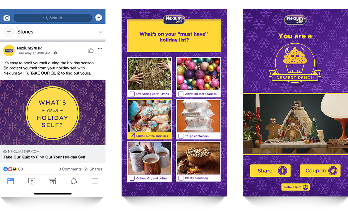 The Nexium 24HR holiday campaign drove engagement during a peak seasonal moment, using a quiz, personalized content, and coupons to turn holiday stress into participation, trial, and action.